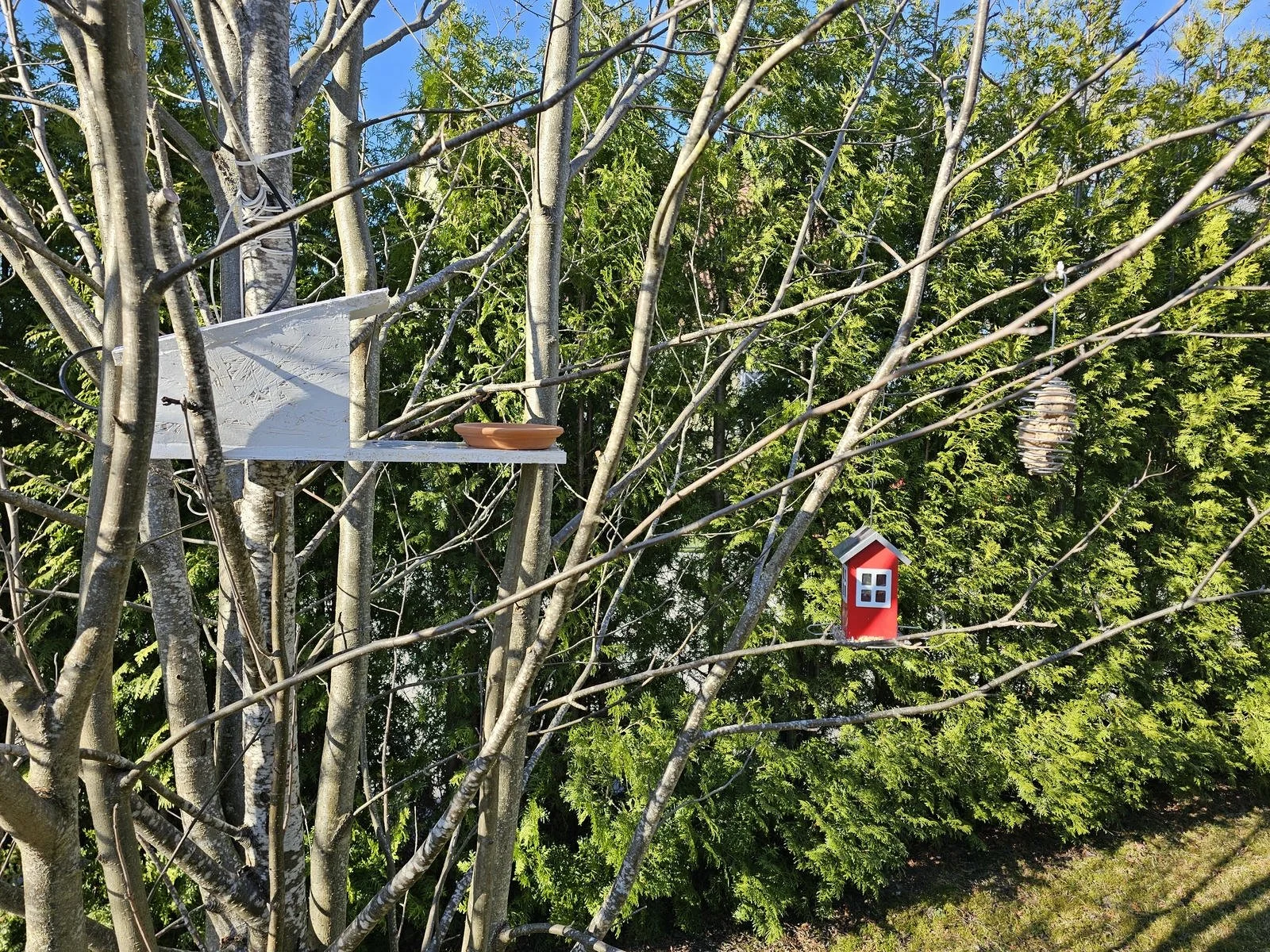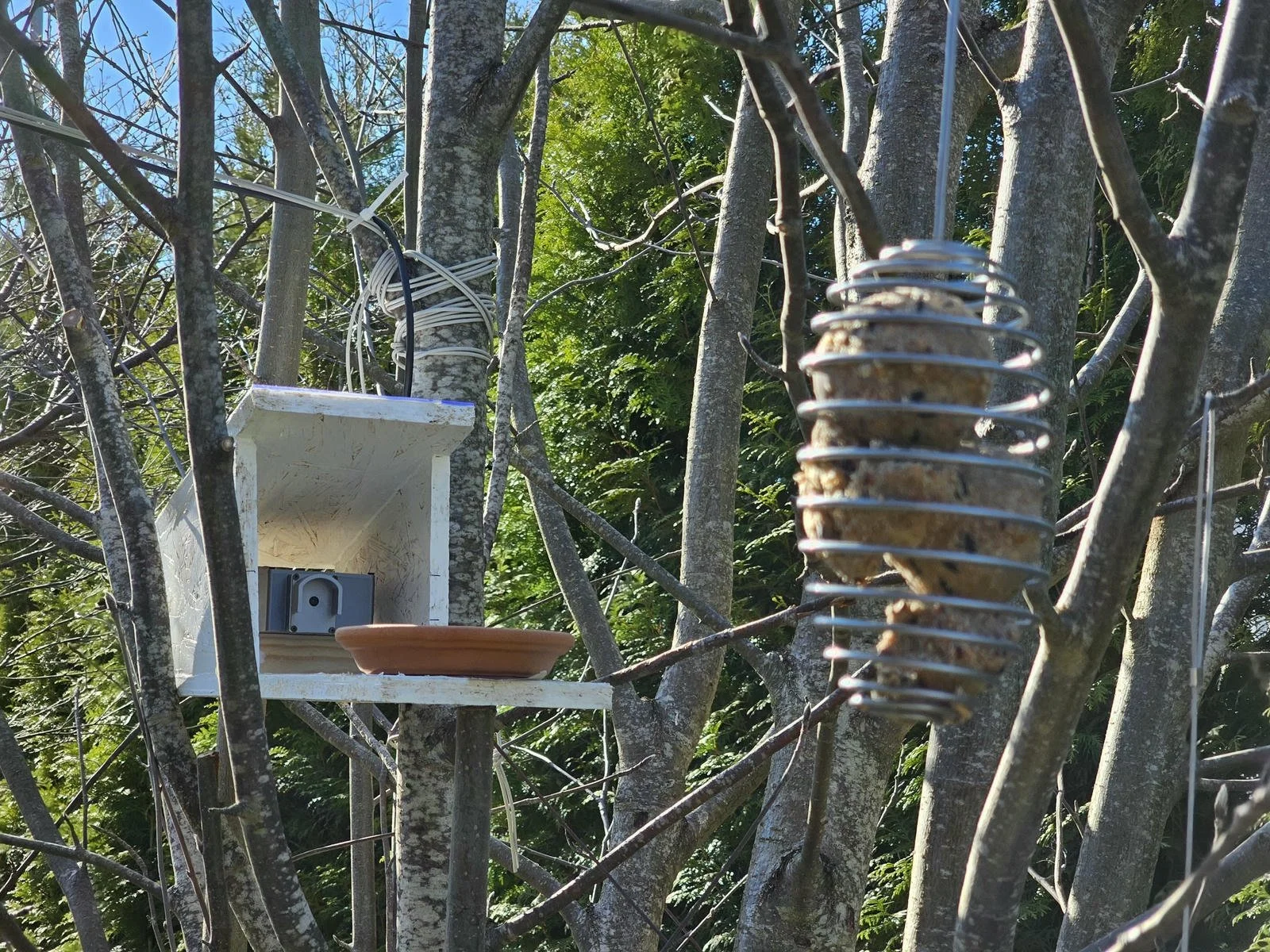 The camera in its shed, pointing at the ceramic plate and the feeder. Both feeders are in the FOV of the camera.