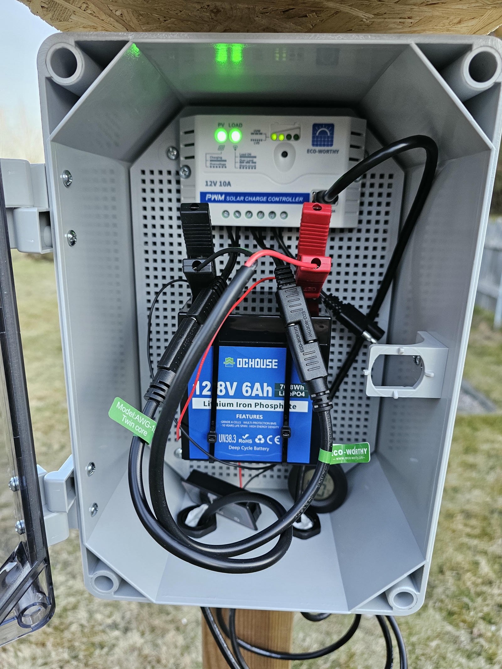 Power management with the PWM charger module and the battery. Encapsuled in a weatherproof box.