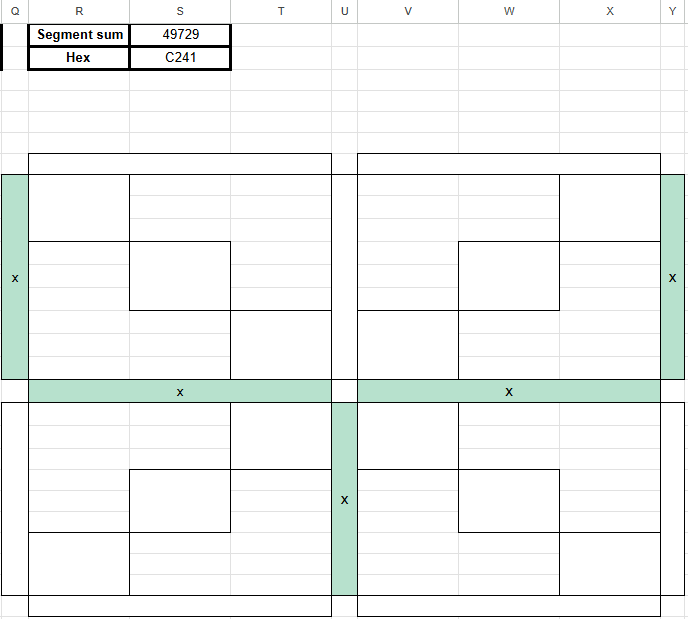 Then, I made a table that consists of 2 rows: the top row is just columns from 0-15, and the bottom row is filled in based on which segment is active (contains an ‘x’). This creates a bridge between the visual and the numerical representation of the segments.