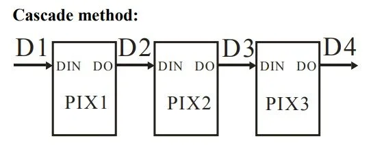 As we can see above, the 24-bit data, read from left to right, starts with the green colour's high bit and then ends with the blue colour's low bit. So, it is important to see that the colour order is GRB and not RGB. But this is completely OK, we just have to pay attention when we write the code. Each LED has such a 24-bit package. Each bit between G7-B0 is assigned with 0 or 1 by applying one of the above-mentioned pulse sequences called “0 code” or “1 code”.