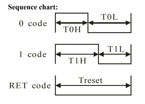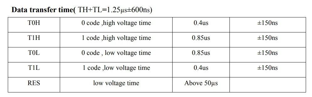 The bits in the above-mentioned 24-bit data package are set according to the sequence chart, which is available in the datasheet of the LED. Each bit is a sequence of high and low pulses with a relatively strict timing. To set a bit 0, its pulse should be high (T0H) for 400 ns, and then it should be low (T0L) for 850 ns. To set a bit 1, its pulse sequence should look the opposite: the high time (T1H) should be 850 ns, and the low time (T1L) should be 400 ns. All these timings allow a +/- 150 ns deviation.