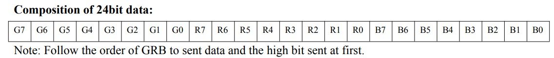 Then, since the WS2812B expects the bits in G, R and B order, we arrange the bytes accordingly into an array.