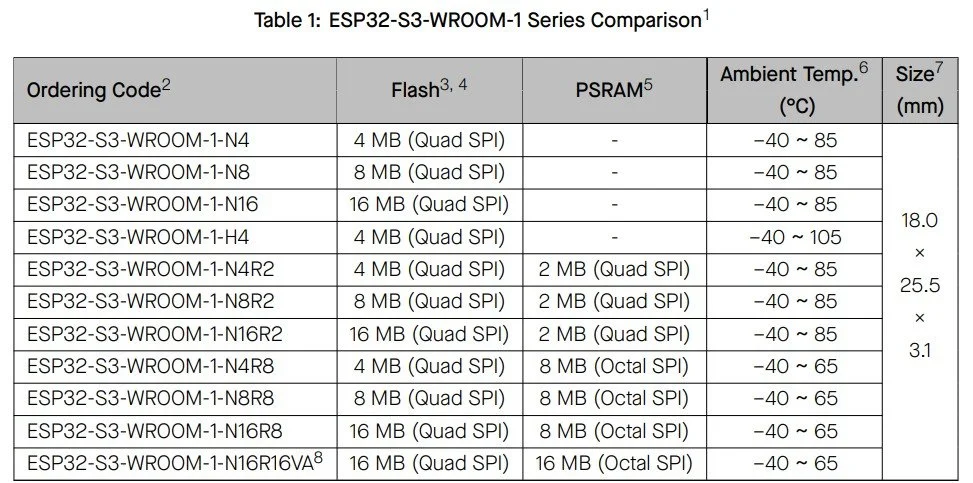 In this demonstration, I am using the ESP32-S3 DevKitC-1 module with an “N8R8” chip on it. The N8R8 means that it has 8 Mb flash (quad SPI) memory (Nx) and 8 Mb PSRAM (Octal SPI) (Rx). There are numerous models in the ESP32-S3-WROOM-1 series, so one must be aware of the naming.