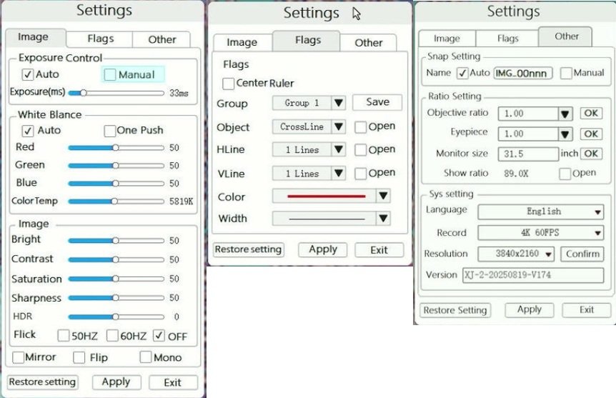 Finally, under the other tab, we can adjust the file name of the saved images, we can adjust the ratios for the objective and eyepiece, and set the size of the monitor. These settings allow us to show the proper magnification on the display. We can also change language, adjust the resolution of the output and the recording and check the version of the camera.